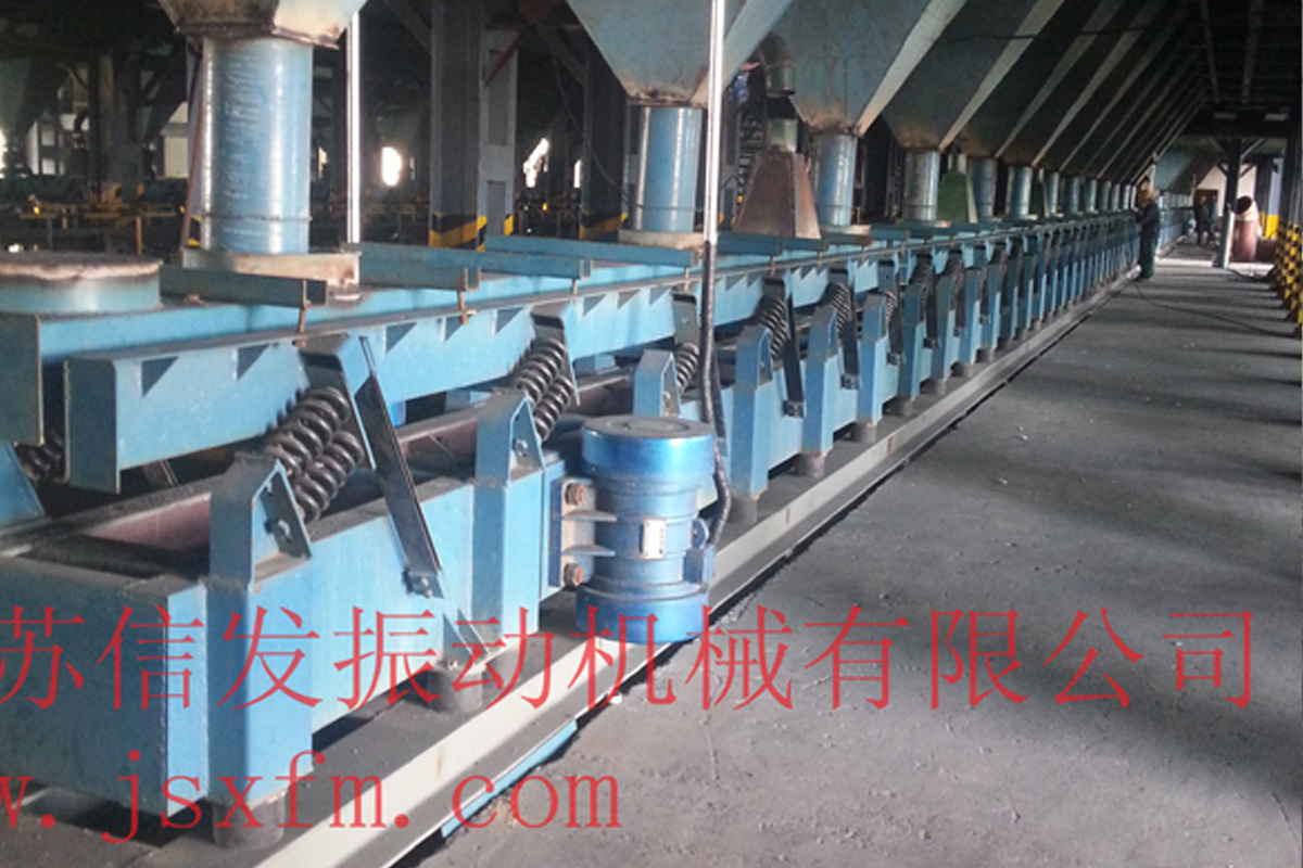 慣性振動(dòng)熱料輸送機(jī)是一種兼有鎖風(fēng)功能的長(zhǎng)距離振動(dòng)輸送機(jī)設(shè)備,采用兩臺(tái)振動(dòng)電機(jī)作為激振動(dòng)源,運(yùn)用自同步原理,兩臺(tái)振動(dòng)電機(jī)反向轉(zhuǎn)動(dòng),使輸送機(jī)底部平衡架產(chǎn)生往復(fù)振動(dòng),經(jīng)過(guò)主振簧與導(dǎo)向板簧的作用,帶動(dòng)上部輸送槽振動(dòng),從而達(dá)到輸送物料的目的。